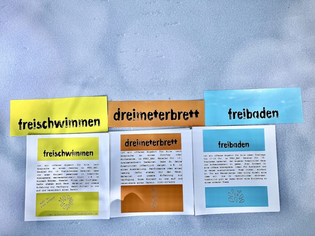 #freischwimmen ist ein offenes Angebot für Alle. freischwimmen bedeutet, dass ihr euer Projekt gemeinsam in kreativer Atmosphäre weiterentwickeln könnt, z.B. im Kontext Wohnen, Theater, Klima oder Dorfleben. Dafür stehen euch Raum, Material und unsere Erfahrung zur Verfügung. Nehmt Kontakt zu uns auf und vereinbart einen Termin für einen Samstag.